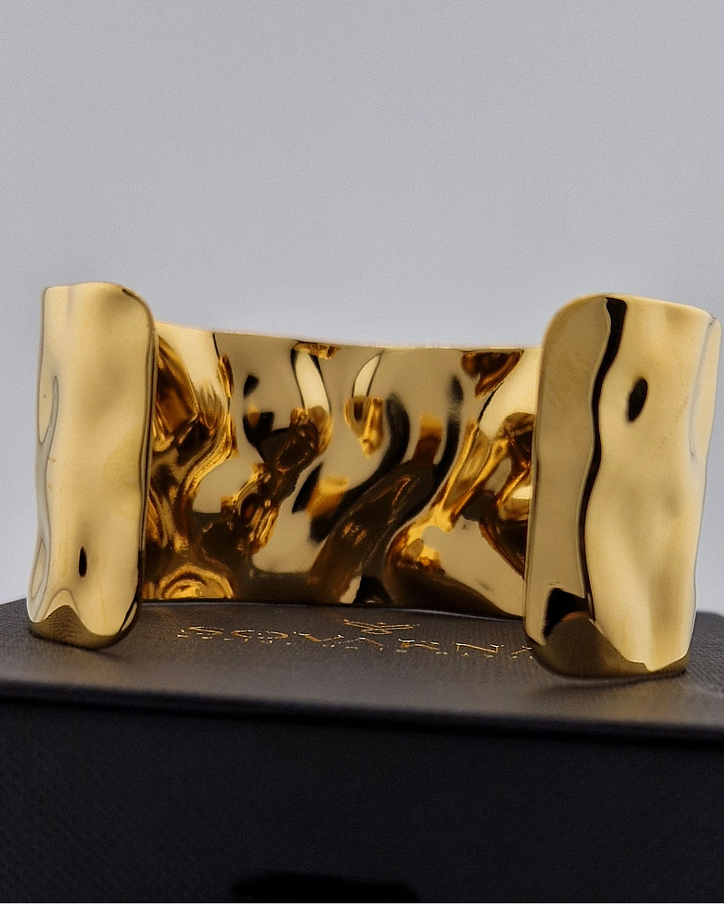 Aurora is a bold statement cuff bracelet featuring a wide, organically hammered surface that reflects light with a sculptural elegance.