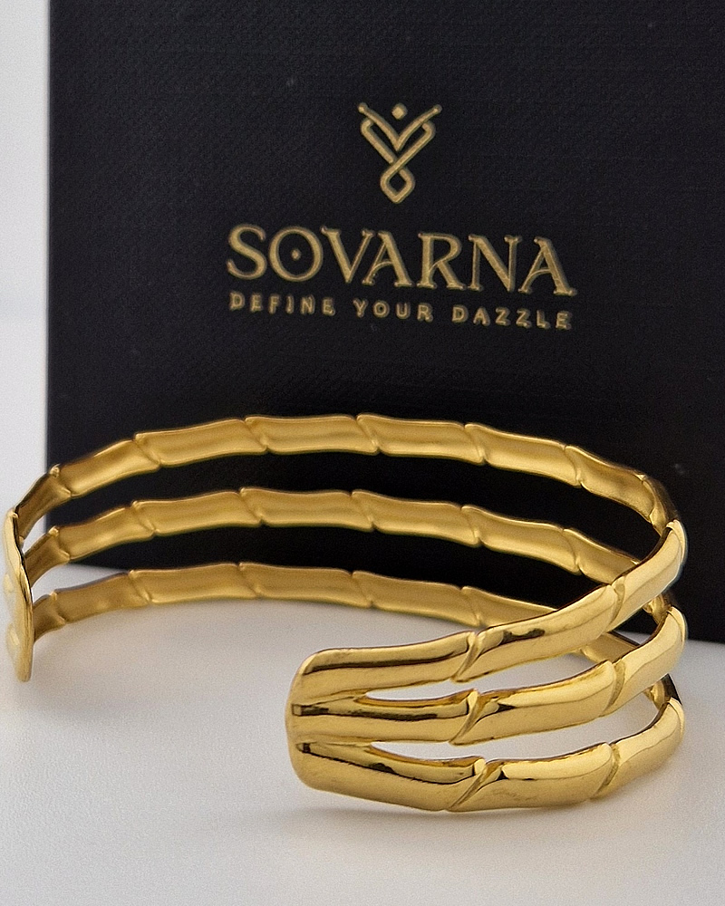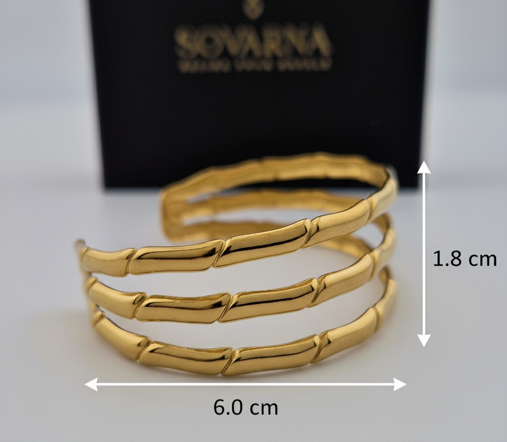The bamboo-inspired texture adds a unique, modern twist while the open cuff design ensures an adjustable, comfortable fit for most wrist sizes. Unlike traditional bangles, this triple layered bracelet gives you the perfect stacked look without needing multiple pieces, making it a versatile accessory for everyday wear or special occasions.