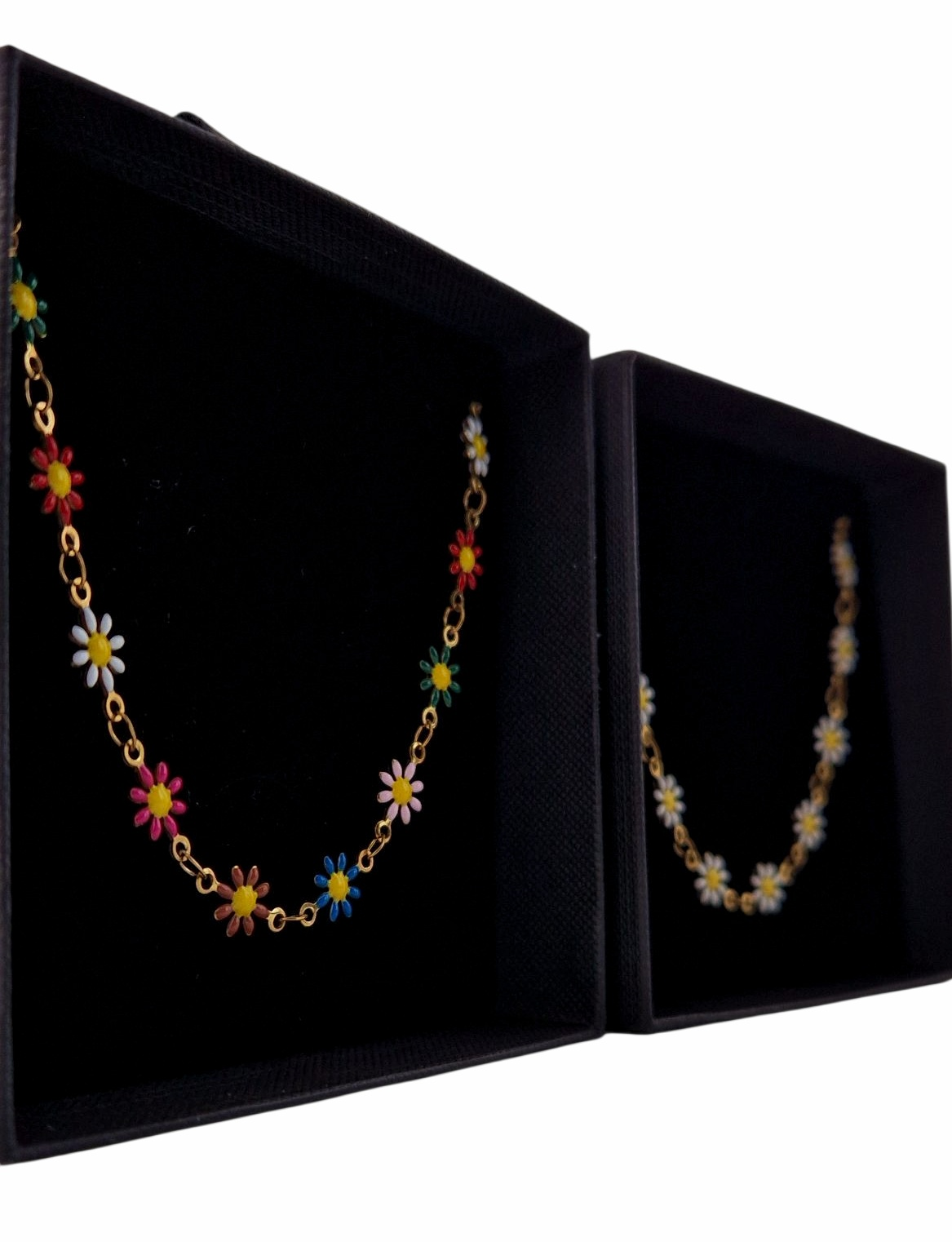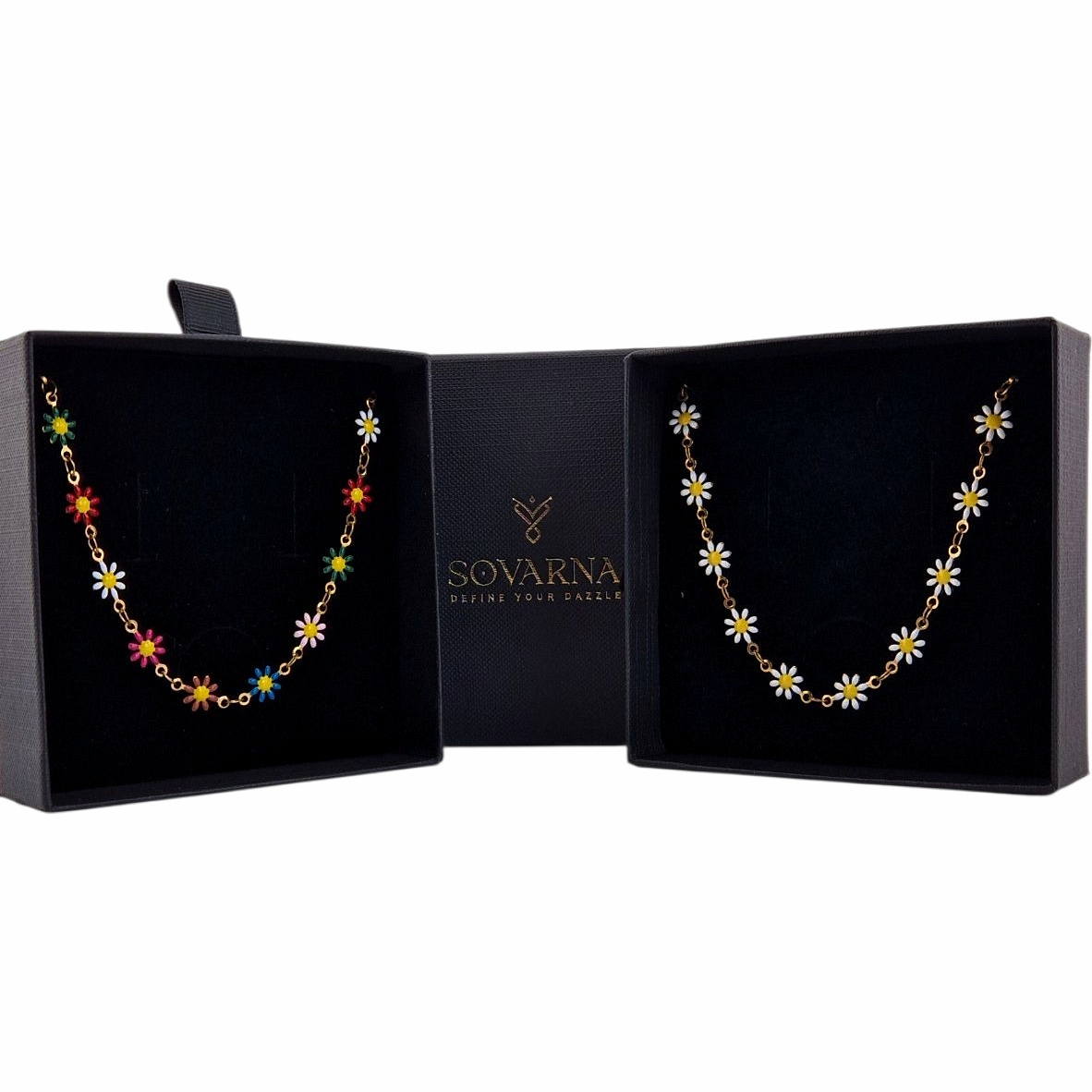 A charming dainty necklace inspired by the beauty of blooming daisies. The SOVARNA Daisy Bloom Necklace features enamel daisy charms on a delicate gold-tone stainless steel chain perfect for adding a fresh, feminine touch to any look. Whether you prefer the playful colours of spring or the timeless simplicity of classic white, this necklace brings effortless joy and sophistication to your style.