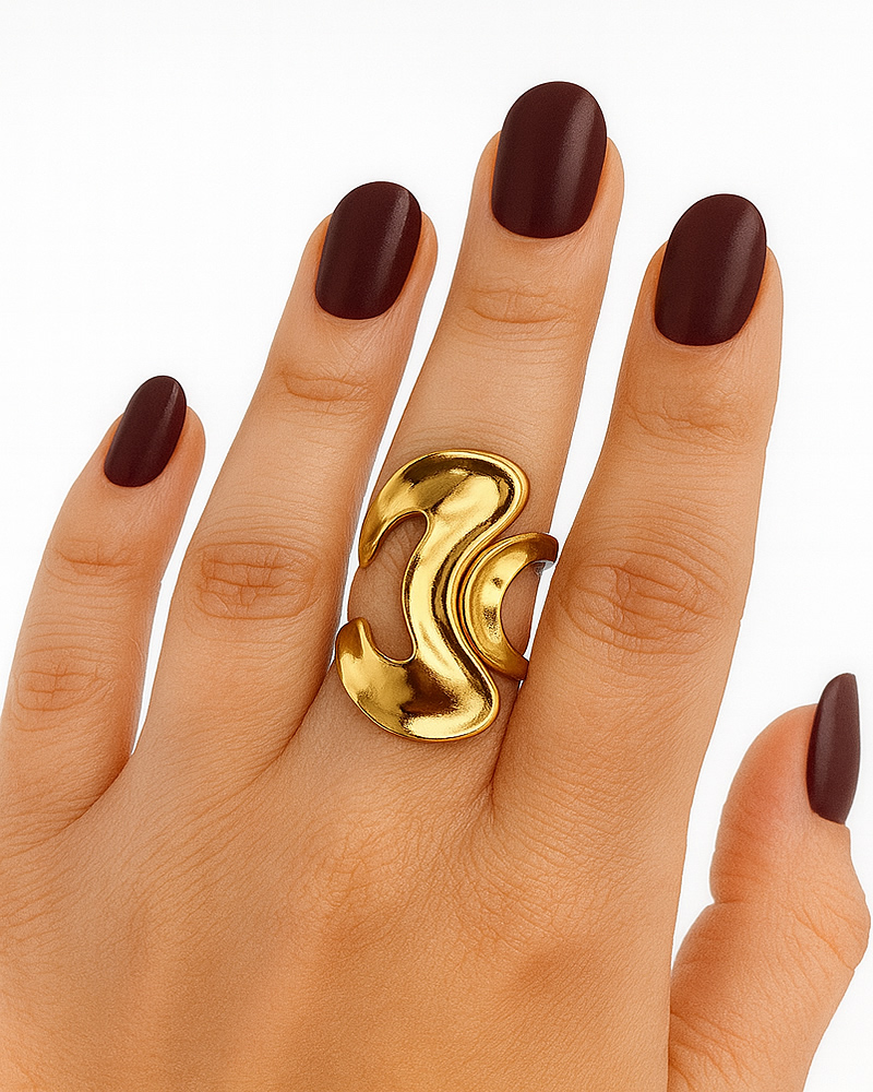 Elaria is a bold and contemporary ring designed with flowing wave-like curves that wrap delicately around your finger. Its open, wide-band silhouette gives the piece a sculptural and eye-catching appeal, while still being lightweight and easy to wear.