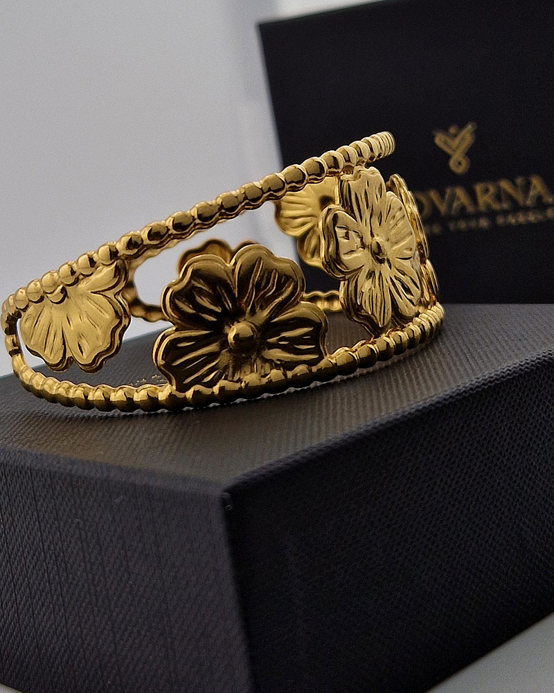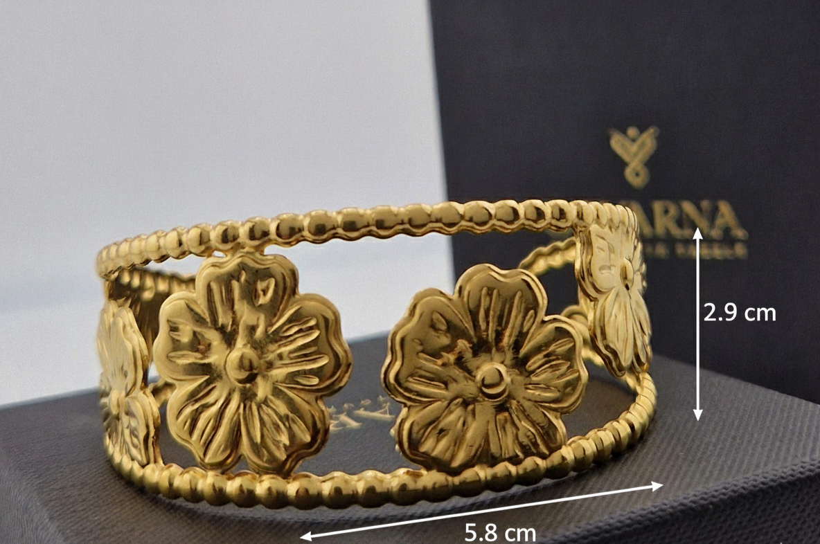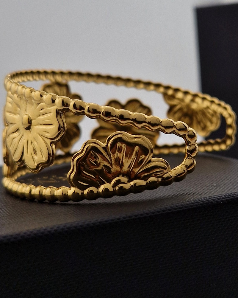 This floral cuff bracelet captures the beauty of nature in a piece that feels both elegant and easy to wear. Crafted from high-quality stainless steel, it’s plated in a polished gold finish that gives it a warm, radiant glow while ensuring it remains resistant to tarnish and everyday wear.