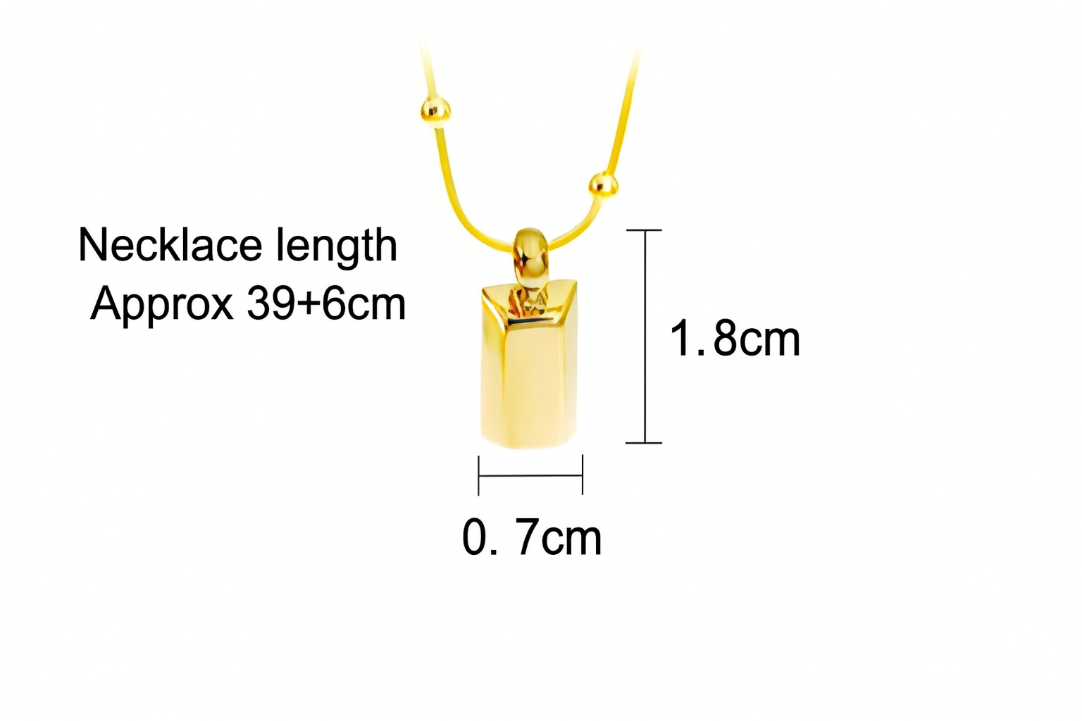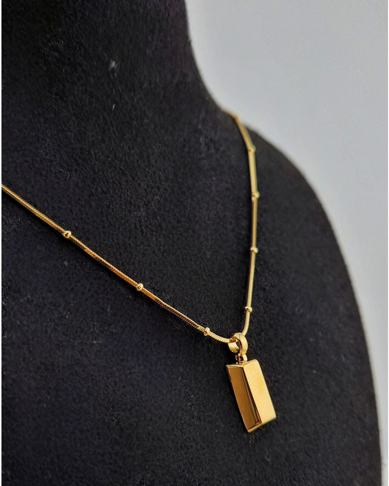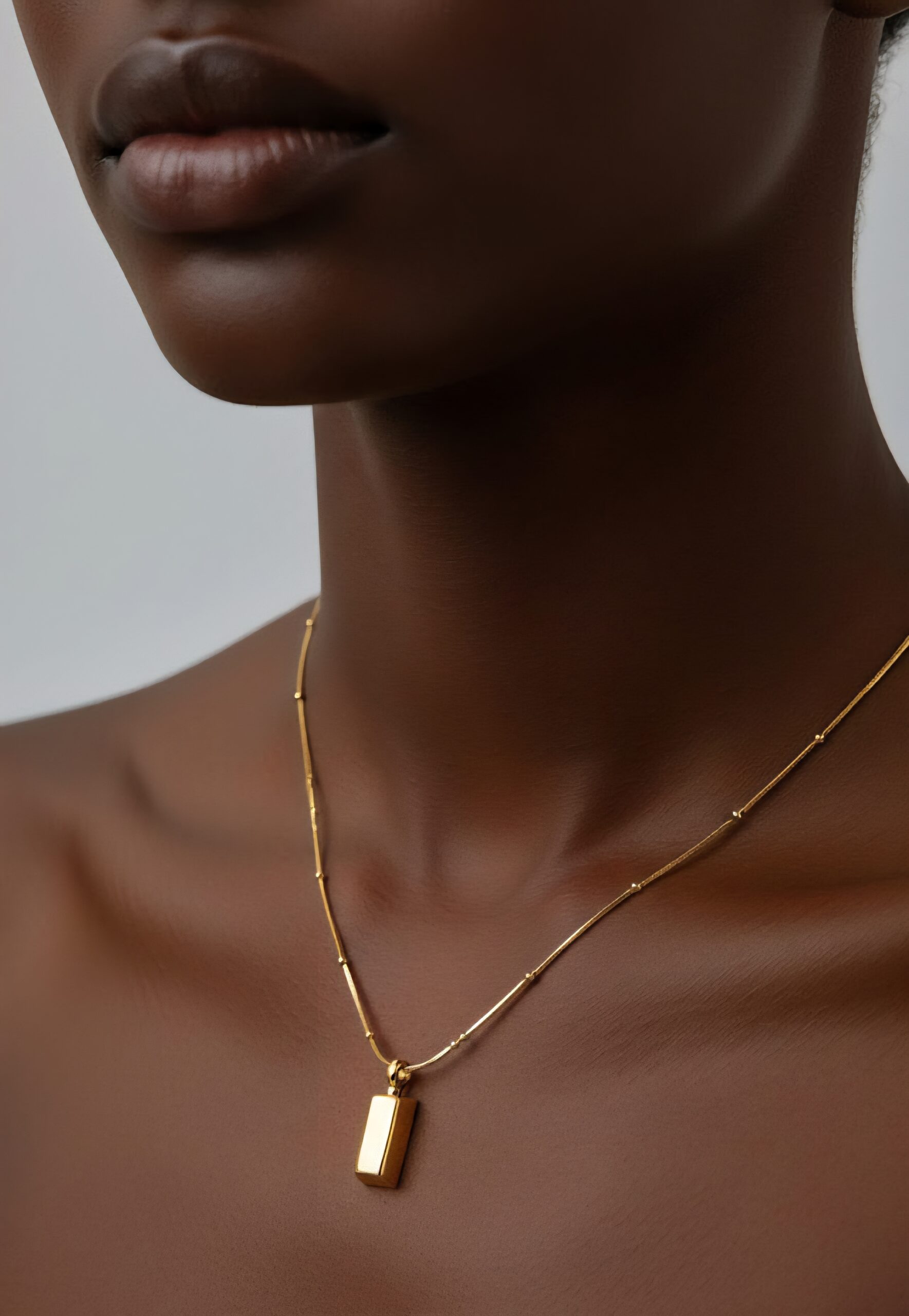 - Pendant Size: Rectangular gold bar pendant with smooth reflective surface.