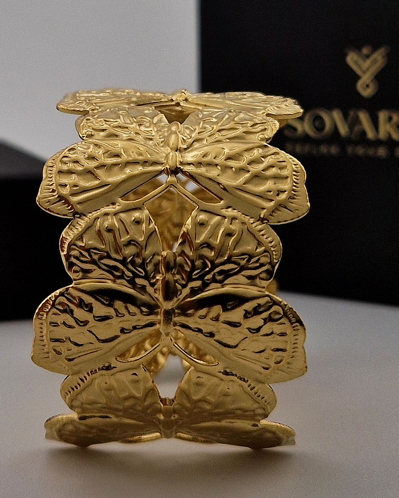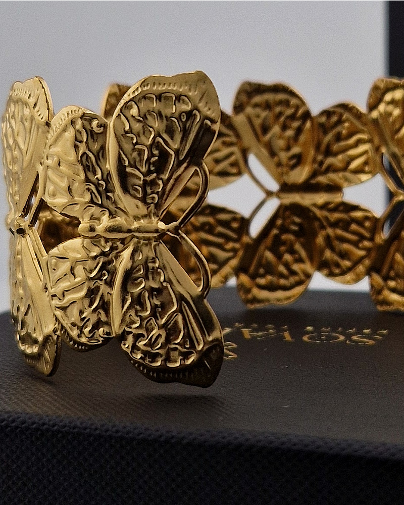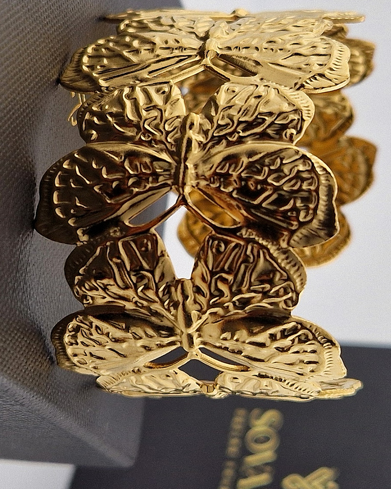The bracelet features a series of large, intricately detailed butterflies, linked together to form a wide, bold cuff. Each butterfly showcases textured wings and a sculpted body, giving the bracelet a luxurious 3D effect. Its open cuff design allows for an adjustable fit, ensuring comfort while making a powerful fashion statement.