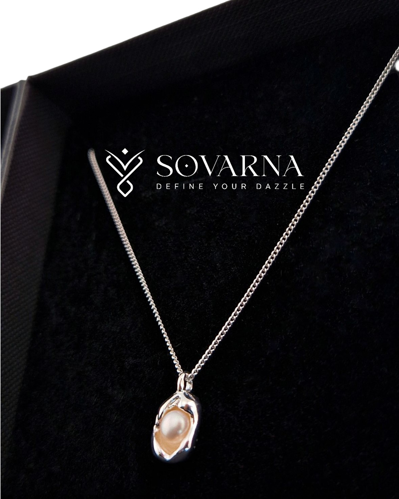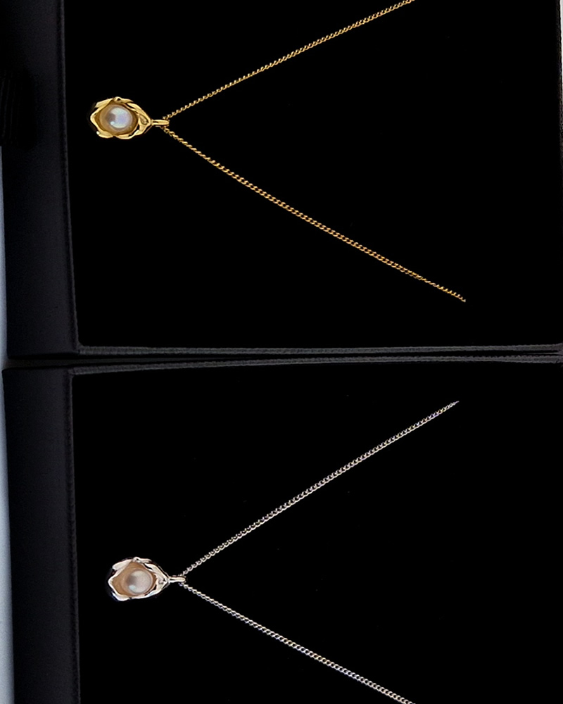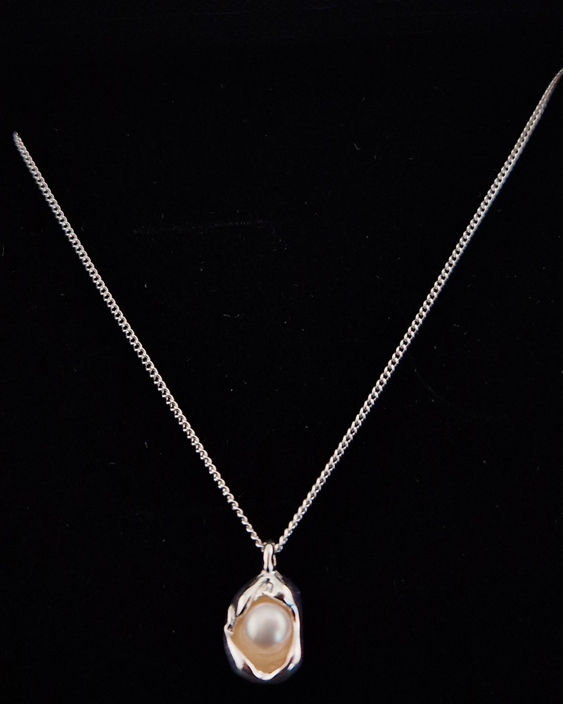 The necklace features a delicate – chain paired with an organic-style pendant frame cradling a luminous pearl at its centre. The unique free-form design contrasts beautifully with the classic smooth pearl, creating a piece that feels both refined and contemporary.