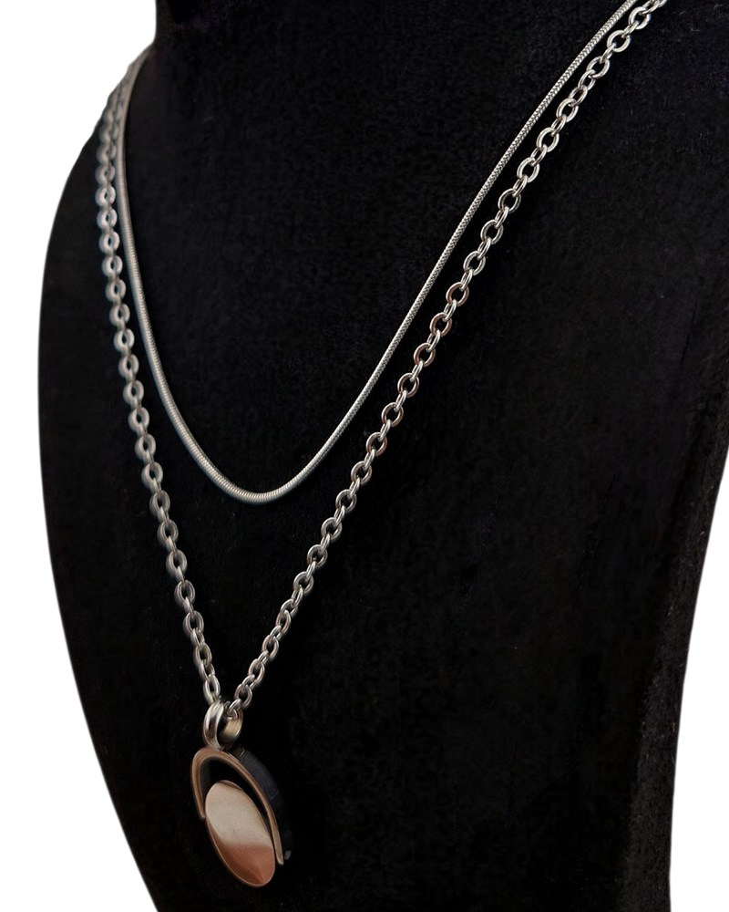 Nova Twin Chain Necklace Set is a two-in-one style essential. This set includes two individually wearable stainless steel necklaces: a sleek flat snake chain and a round pendant chain with a flip-over dome charm.