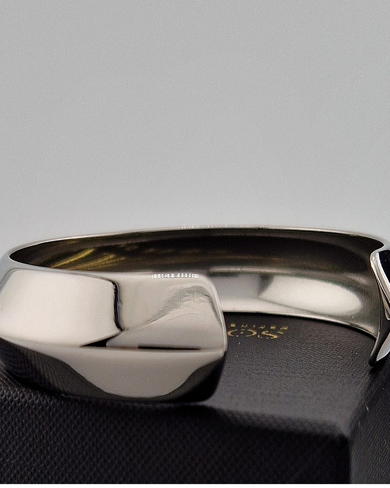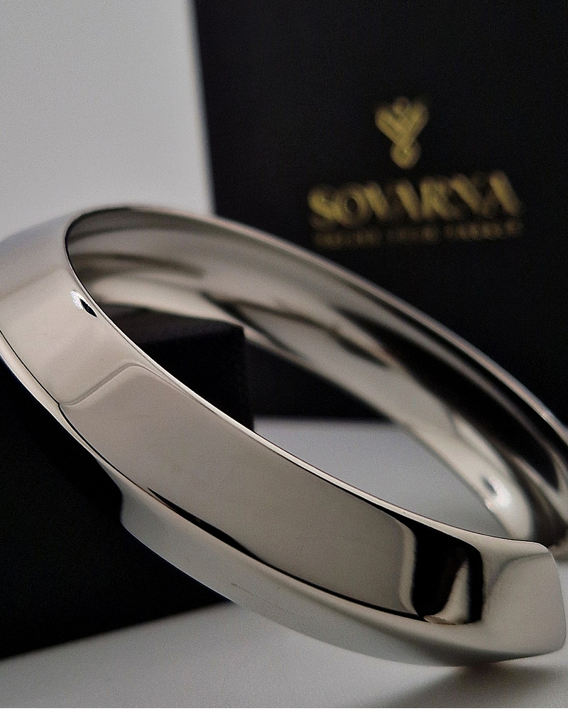 The bracelet features a wide, angular silhouette that reflects light beautifully, giving it both a sculptural and luxurious appeal. Its clean lines and bold presence make it a versatile piece that works just as well with casual outfits as it does with formal wear.