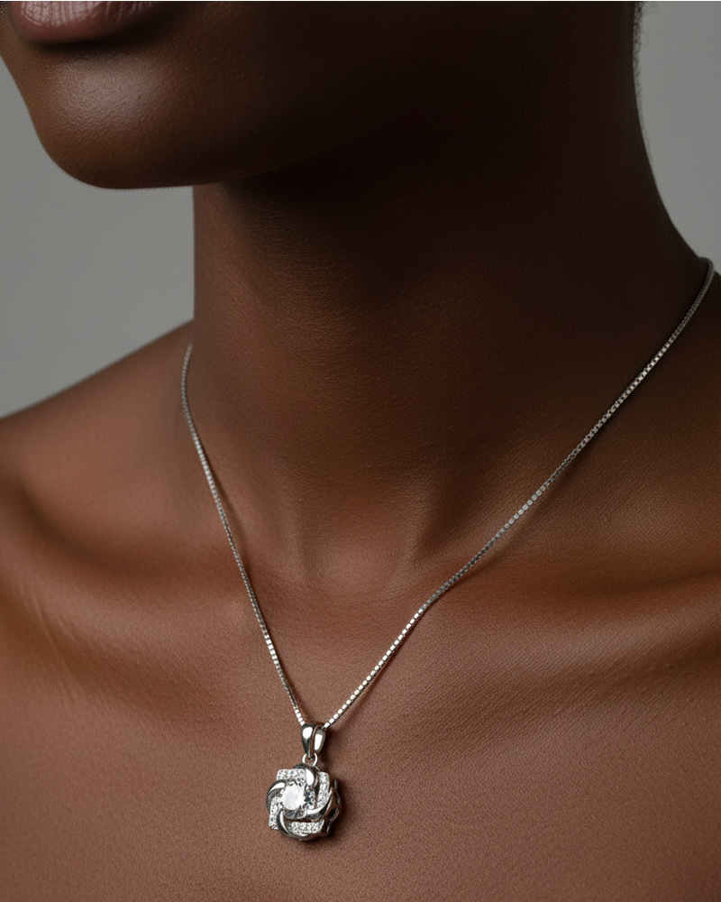 • Pendant: Floral-inspired bloom setting with 1-carat moissanite centre.