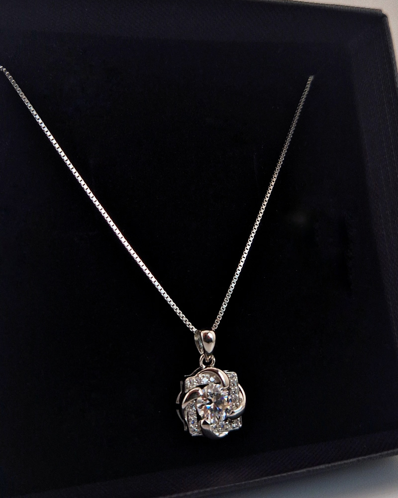 The SOVARNA Bloom Necklace radiates timeless sophistication with its floral-inspired design, beautifully crafted from 925 sterling silver. At its heart lies a brilliant 1-carat moissanite, encircled by petal-like curves and delicate pavé detailing that captures light from every angle. Suspended on a refined box chain, this piece adds effortless elegance to both everyday wear and special occasions.