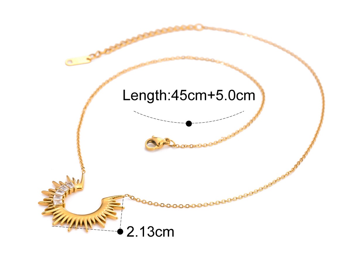 Make a radiant statement with the Starburst Stainless Steel Necklace, designed to capture the brilliance of sunlight in a modern, luxurious piece. This stunning necklace features a bold starburst pendant embellished with cubic zirconia accents, symbolising light, confidence, and timeless elegance.
