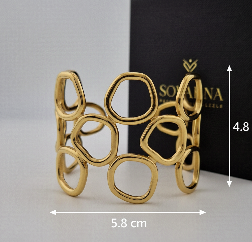 The Zahara Open Oval Link Cuff is a bold and contemporary bracelet that combines minimalism with statement style. Featuring interconnected open oval links, this sculptural cuff is crafted from high-quality stainless steel with a polished gold finish.